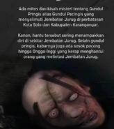 The Gundul Pringis is quite a popular ghost among Javanese people. Gundul means bald, while Pringis means smile. Locals believe it's originated as a result of death via decapitation or death that separates the body from the head.