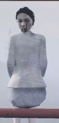 Lady on the Bridge appears as a middle-aged woman with black hair, pale skin and bleeding eyes.