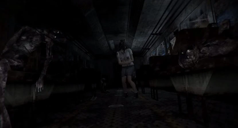 The screen fades to black and what do we see? Linda looking rather exhausted, holding her stomach and limping along, with flashbacks from both Act I and the Demo, before she collapses from presumably exhaustion. Ira is still crying in the background by the way, but somehow it kind of morphs into Linda panting? I can't really tell since Linda never speaks and I can't tell her heavy breathing from's Ira's heavy breathing....Someone is heavy breathing okay? I don't know who... Well, anyways, Linda seems to be limping along a wonderfully depressing train car with ugly looking possibly burnt corpses that look fresh out of Silent Hill. Another thing to note is that Linda is not in the posession of her red bag or her camera. As a side thing, I'm going to ask you to remember this scene for later on? Kapish? So why isn't Linda holding her bag? Two possibilities, one of them definitely more likely than the other. Linda gave her bag and her phone to someone else for whatever reason (probably to use for thier defense) OR Linda got attacked by a ghost or such and therefore lost her bag and phone. The second reason seems more plausible because Linda seems so injured/exhausted, so it's more likely that she was attacked and that our lovely protagonist just barely got away. What ghost attacked her, we don't know yet, but I have a pretty good idea. I'll explain later on in the analysis.